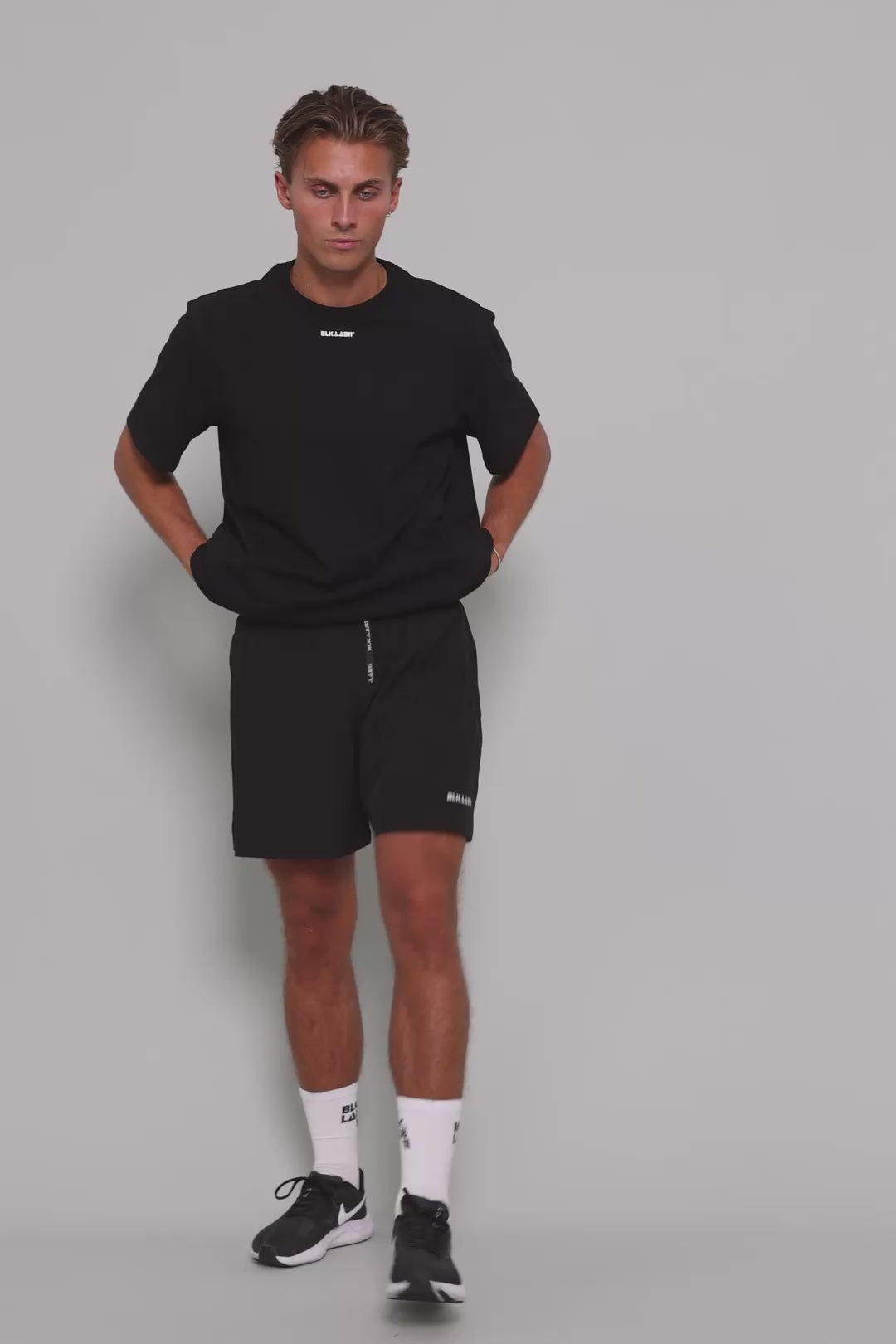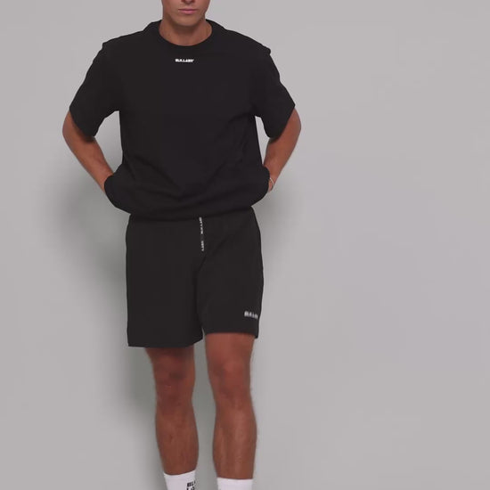 Elastisk linning med snøre for en sikker pasform. Minimalistisk sort design med diskret BLK.LAB11-branding – din uundværlige trænings shorts til fitnesscenteret, løbeturen eller i hverdagen.